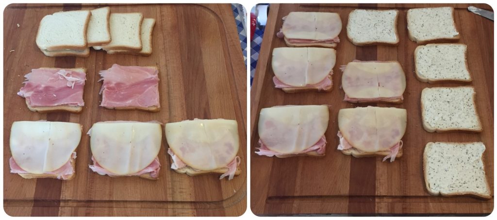 Lege dann ein Sandwich auf das andere und schneide es zuerst in der Mitte und dann erneut in der Mitte, sodass aus jedem Sandwich 4 Türmchen entstehen, die du mit einem langen Zahnstocher befestigst.