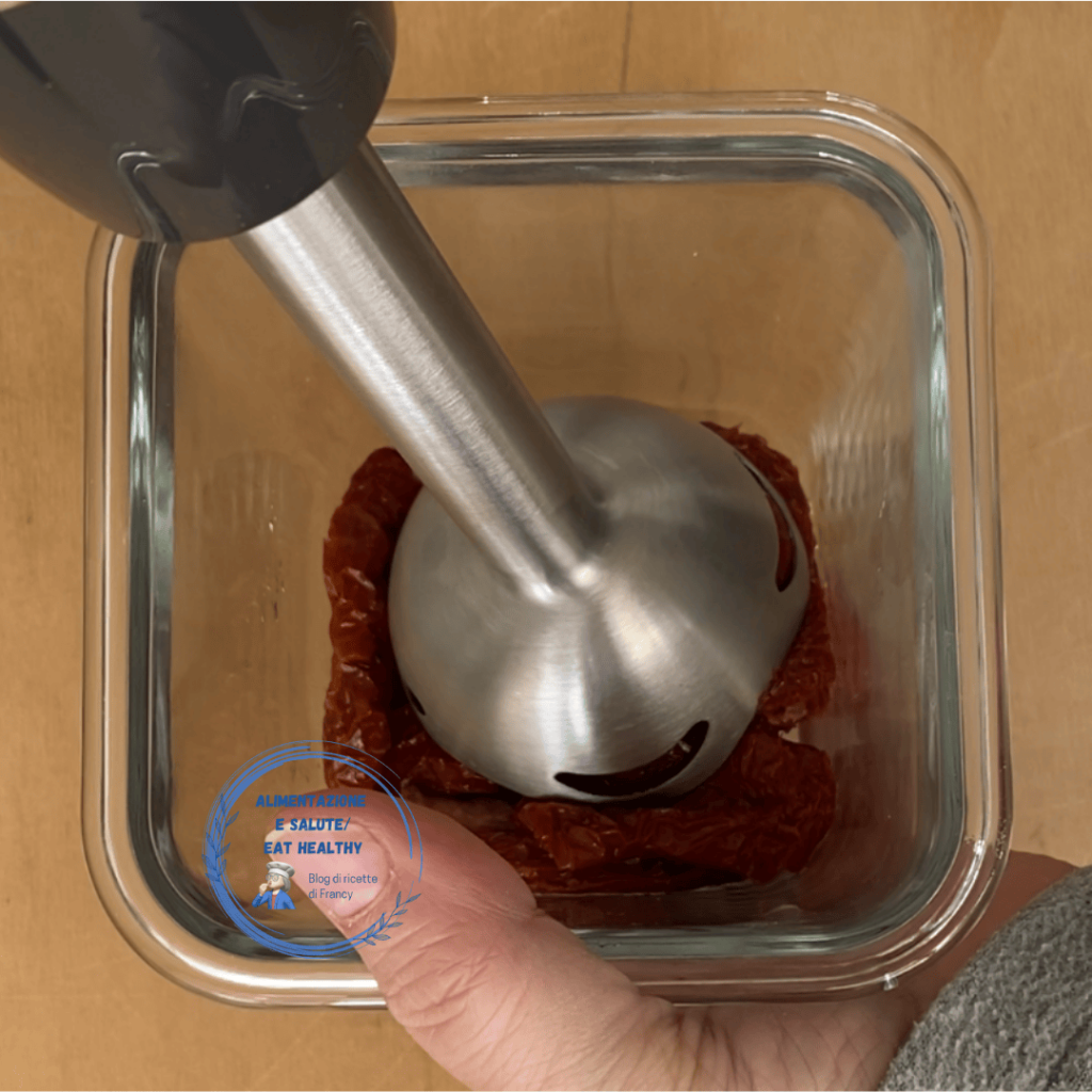 In der Zwischenzeit, lass die getrockneten Tomaten in Öl abtropfen und trockne sie mit Küchenpapier ab, um das überschüssige Öl zu entfernen. Gib sie in einen Mixer oder Zerkleinerer und mixe, bis du eine Creme erhältst.