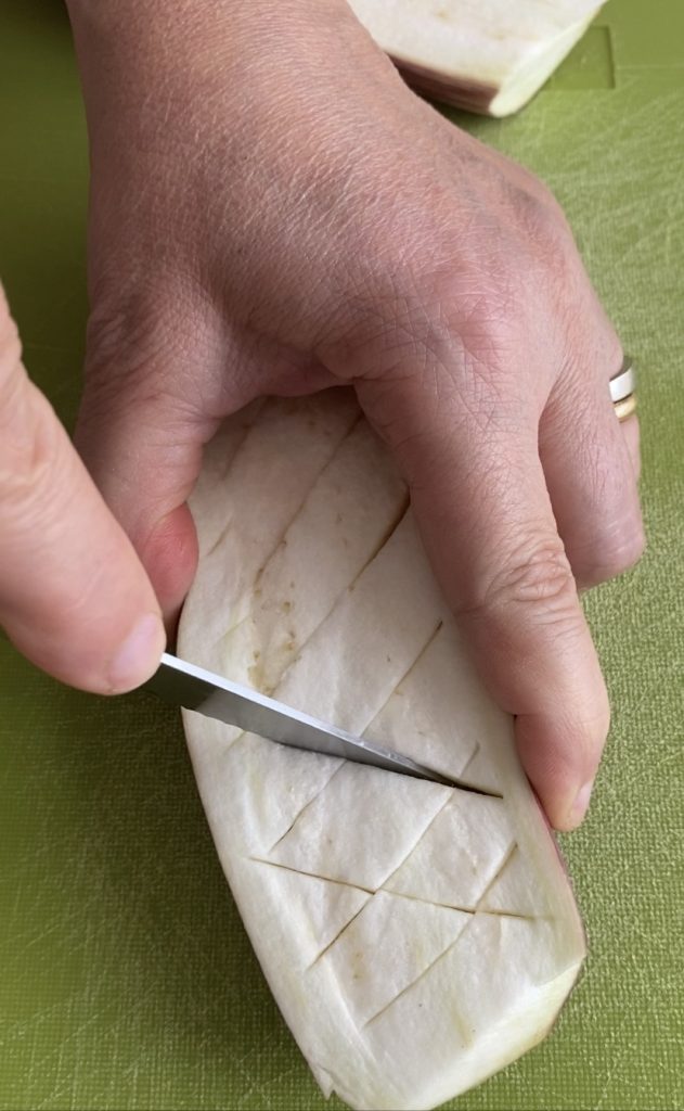 Die Aubergine längs schneiden und mit einem Messer Rauten einritzen.