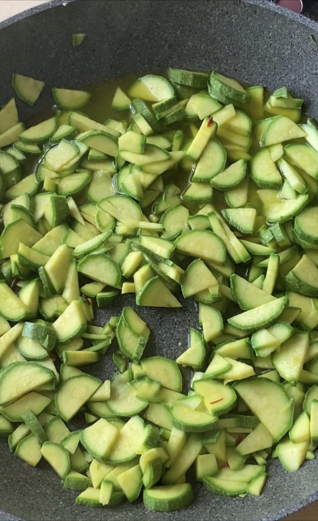 Die restlichen drei in Stücke geschnittenen Zucchini in eine Pfanne geben.