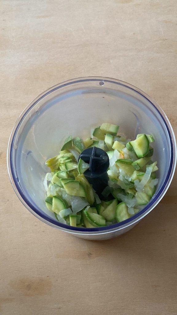 In einer Pfanne die Zwiebel anbraten, die Zucchini hinzufügen und für ein paar Minuten kochen, dann in einen Mixer geben.