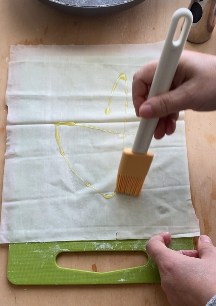 Ein Blatt Filoteig mit etwas extra nativem Olivenöl bestreichen und so für drei Blätter fortfahren, die Sie übereinander legen, um drei Schichten zu schaffen.