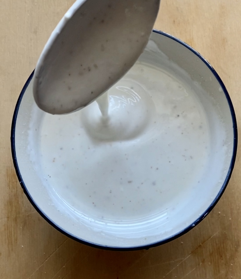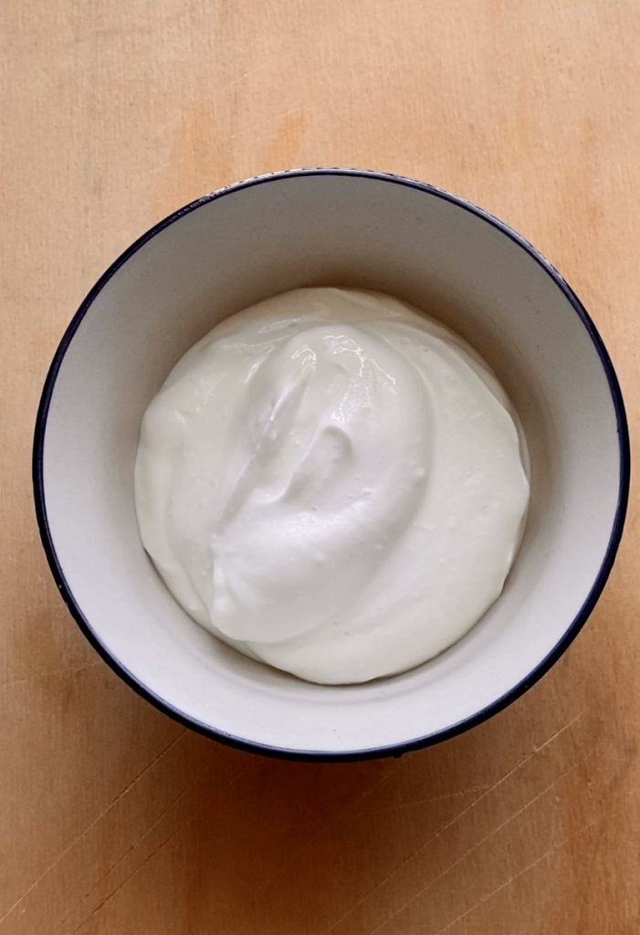 • In einer kleinen Schüssel den griechischen Joghurt und den halben Esslöffel extra natives Olivenöl geben.