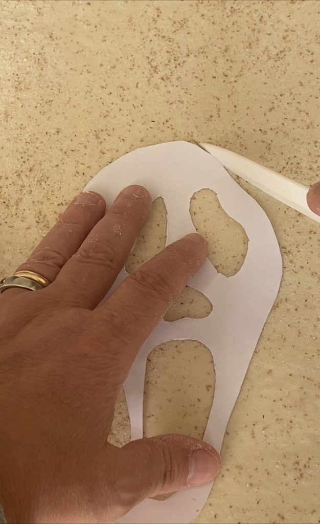 Auf ein Backpapier das Gesicht von Scream zeichnen, die Zeichnung auf die Focaccia legen und mit einem Messer die Kanten schneiden und den Teig der Focaccia in Form von Scream, einem Geist und einem Kürbis modellieren. Es sollte darauf geachtet werden, wenn die Kinder sehr klein sind.