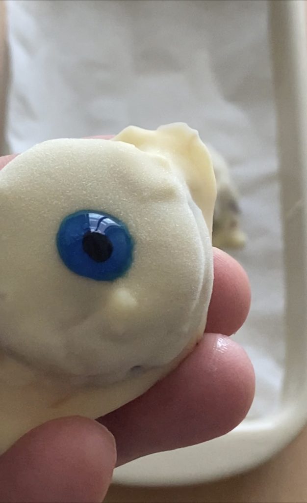 Nach einer Stunde herausnehmen und mit den Stiften dekorieren, indem Sie einen blauen Kreis zeichnen (der blaue Kreis des Auges kann durch ein Smarties erreicht werden, das vor dem Einfrieren des Auges hineingelegt wird), in den blauen Kreis einen schwarzen Kreis zeichnen, den blauen Kreis mit dem schwarzen Stift umrunden und schließlich das Auge mit dem roten Stift streifen.