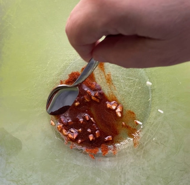 • In der Zwischenzeit eine halbe Knoblauchzehe in einer Schüssel in Stücke schneiden, etwas Öl und einen Teelöffel Paprikapulver hinzufügen.