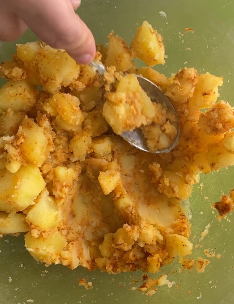 • Die Kartoffeln abgießen und mit dem Knoblauch und Paprikapulver vermengen, mit einer Gabel zerdrücken und abkühlen lassen.
