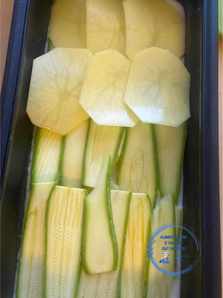 • Mehrere Schichten bilden, indem man abwechselnd Zucchinischeiben, Kartoffelscheiben und Stracchino legt.