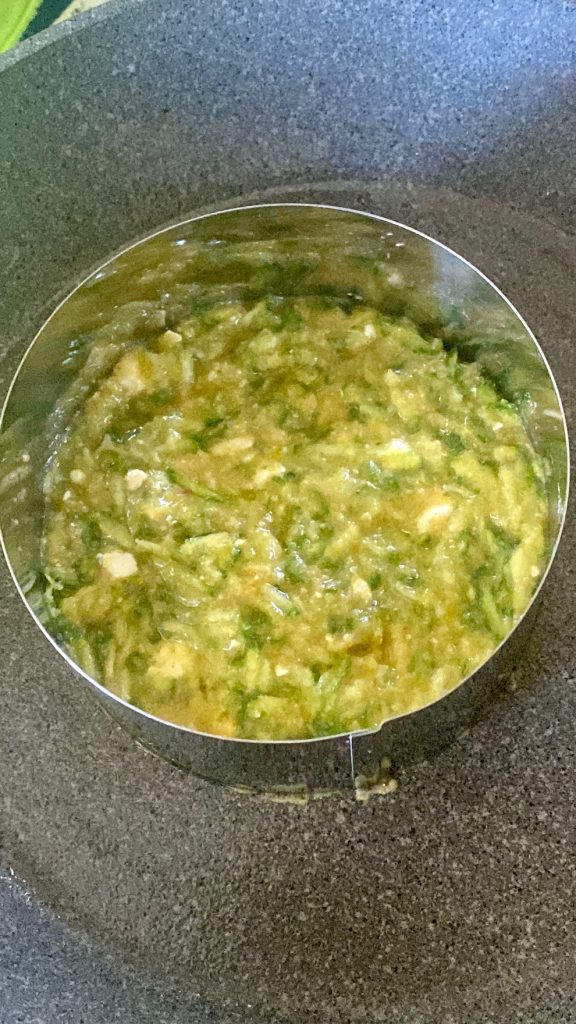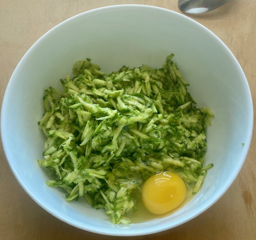 Die mühsamste Arbeit bei diesem Gericht ist das Reiben von sechs mittelgroßen Zucchini in einer Schüssel. Ich verwende normalerweise die hellen, die nie zu groß sind, und drücke sie dann gut aus.