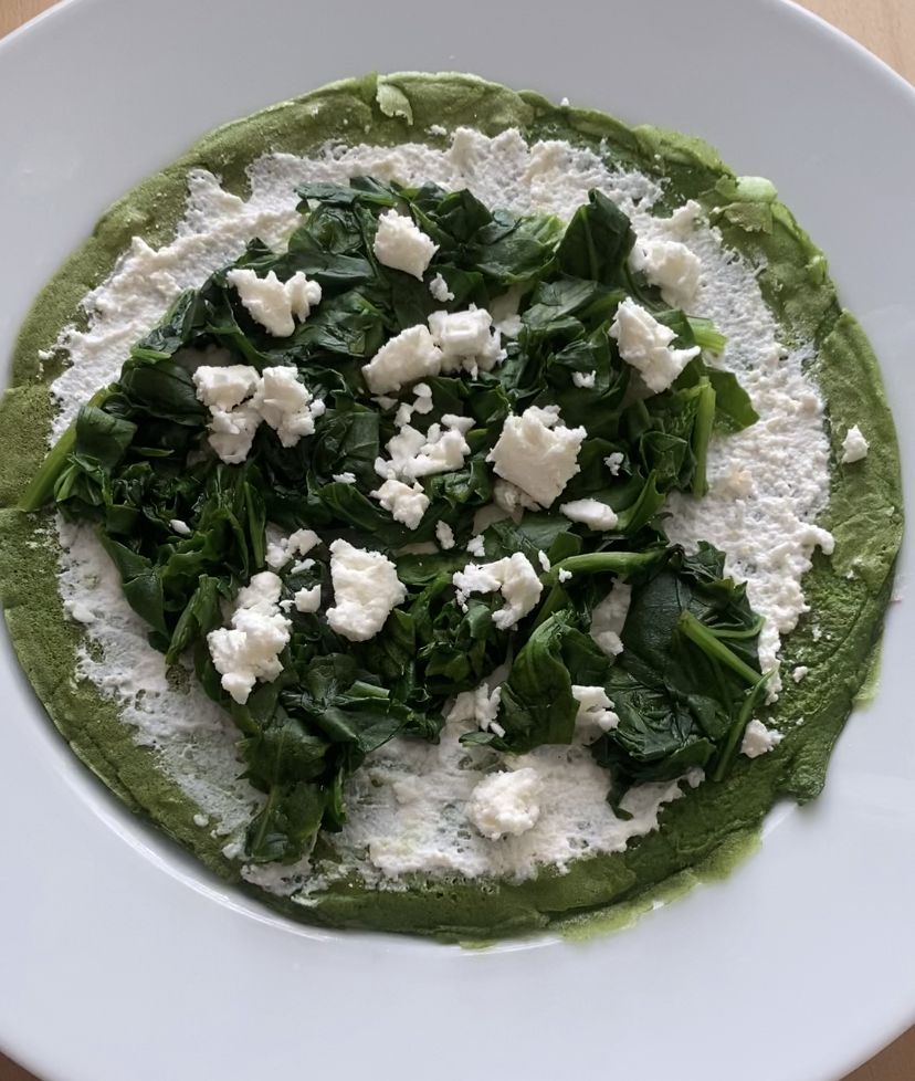 Die Füllung des dritten Crêpes ist aus Ricotta, Mangold und Feta, ich habe ihn gerollt, mit Ricotta bestrichen und die Samen hinzugefügt.