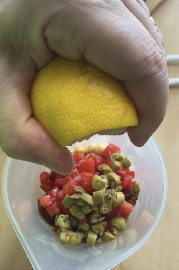 Zum Schluss die grünen Oliven hinzufügen, eine halbe Zitrone auspressen und pürieren.