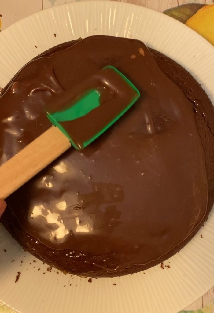 Gieße die geschmolzene Schokolade über den Kuchen und lass ihn im Kühlschrank abkühlen.