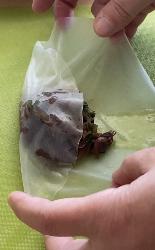 Verzweifelt, keine Lust mehr, in den Supermarkt zurückzukehren, habe ich in der Speisekammer nachgeschaut und eine Packung Reispapierblätter gefunden.