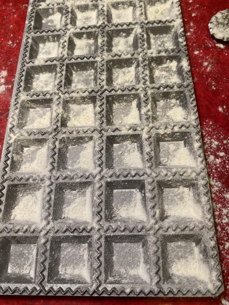Das so erhaltene Teigblatt auf die Form legen oder wie wir in Zena sagen, eine Ravioliera, die zuvor bemehlt wurde.