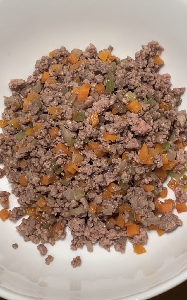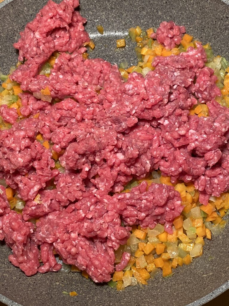 Während der Teig ruht, die Fleischfüllung zubereiten.
