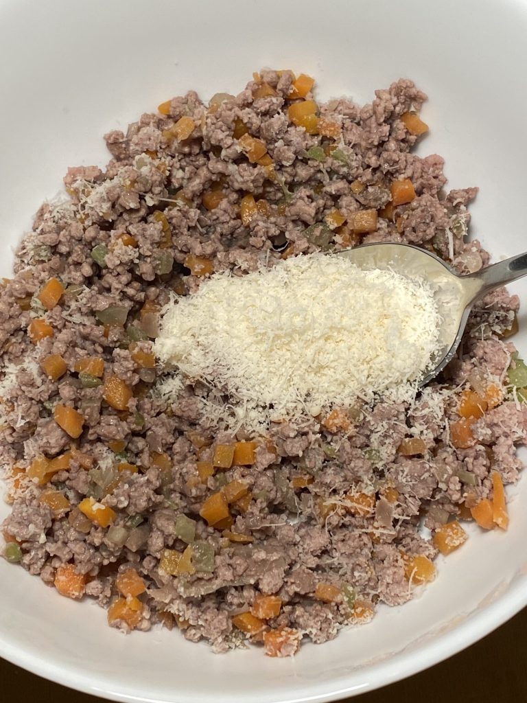 Die Füllung in eine Schüssel geben, den Parmesan hinzufügen und vermengen, eventuell mit Salz abschmecken.