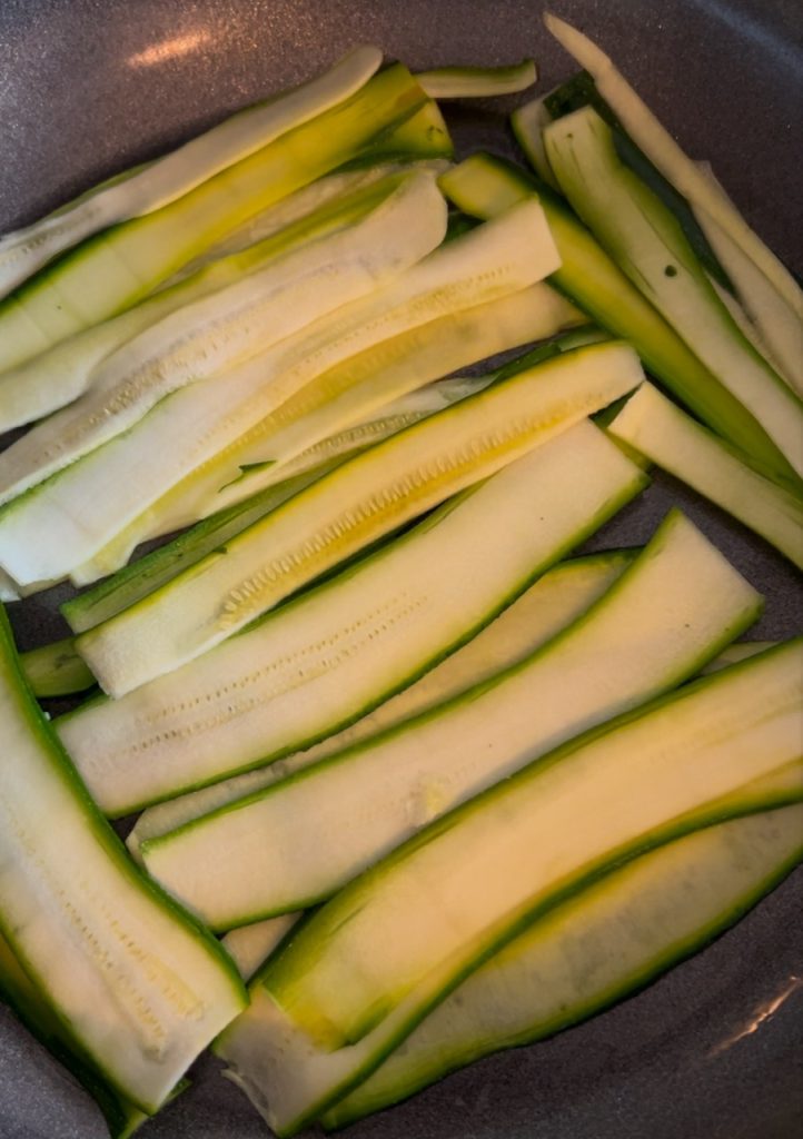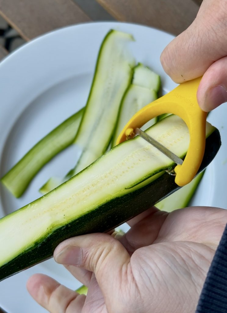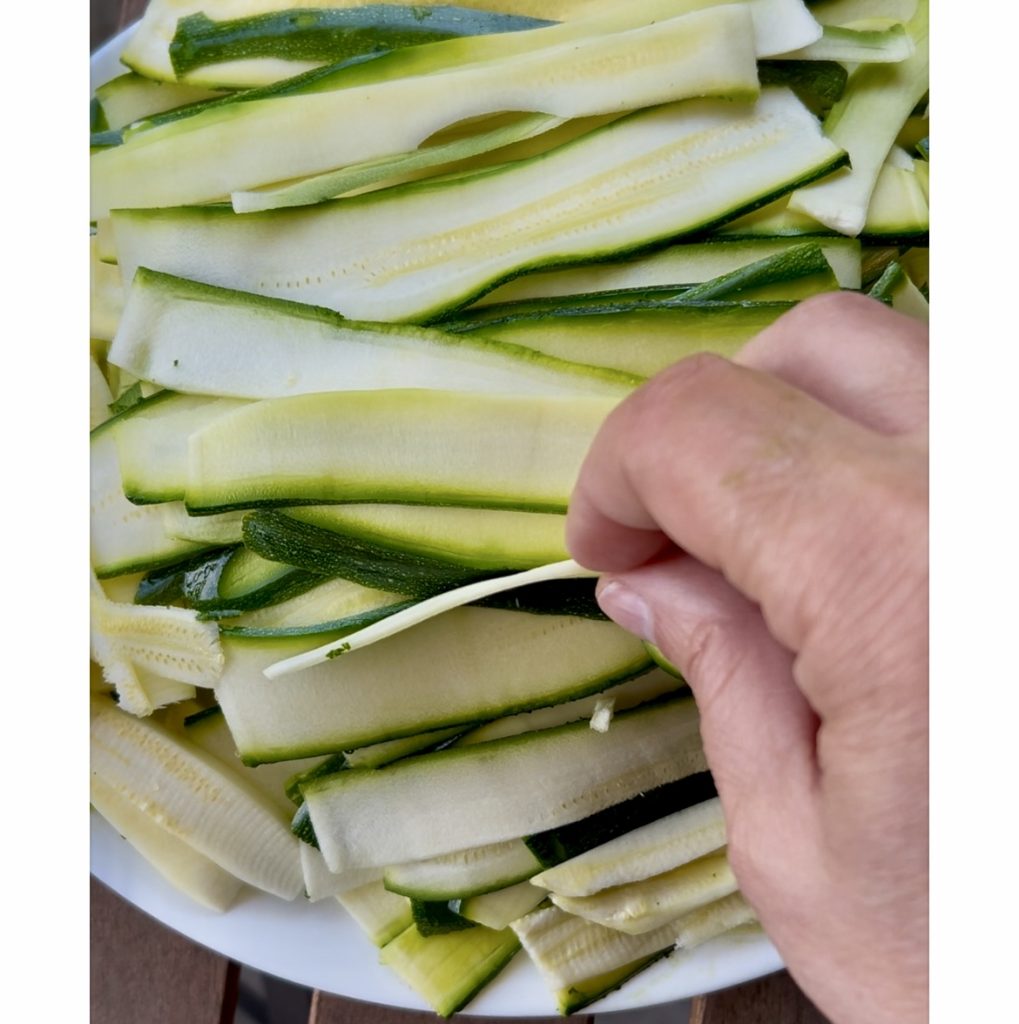 Wie du im Bild siehst, sind die Zucchini wirklich dünn, deshalb empfehle ich eine Mandoline oder, wenn nicht vorhanden, einen Gemüseschäler: Das sind die einzigen Werkzeuge, die du wirklich brauchst, um eine gleichmäßige und schnelle Garzeit zu erreichen.