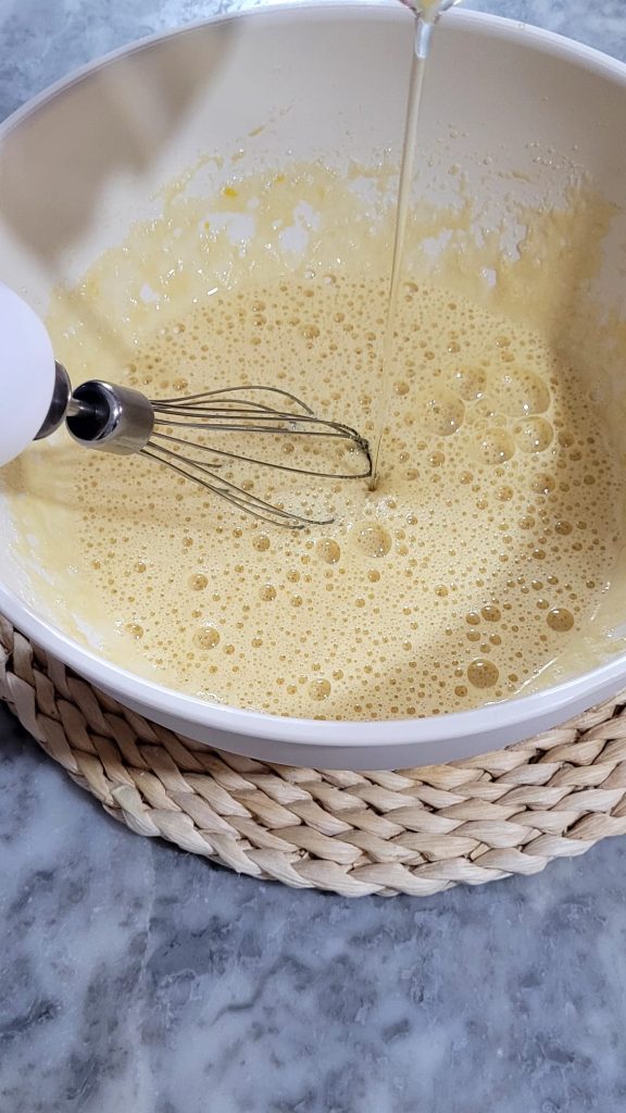 In einer anderen Schüssel schlagen Sie die Eier mit dem braunen Zucker und dem Salz, bis eine aufgeblähte und schaumige Masse entsteht