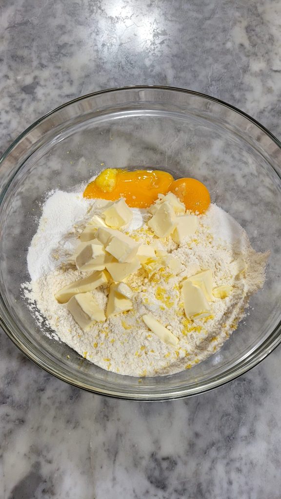 In einer Schüssel Mehl, Zucker, Backpulver, Eigelb, die geriebene Zitronenschale und Salz verarbeiten