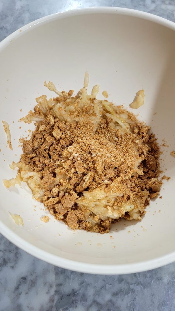 Jetzt den Belag zubereiten: Nach dem Waschen, Schälen und Entfernen des Kerngehäuses und der Samen die Birnen mit einer groben Reibe reiben.