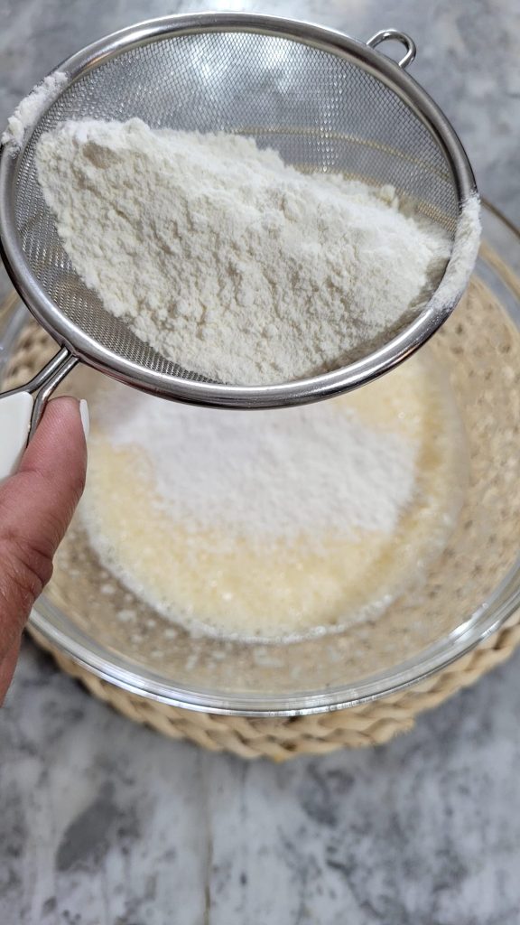 Fügen Sie das gesiebte Mehl und das Backpulver hinzu und rühren Sie weiter, bis Sie eine homogene Mischung erhalten