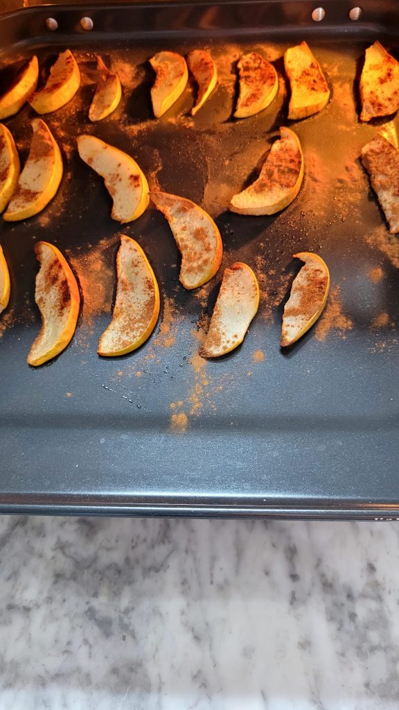 Nehmen Sie eine Backform und verteilen Sie die Birnenscheiben darin, bestreuen Sie sie mit Zimt
