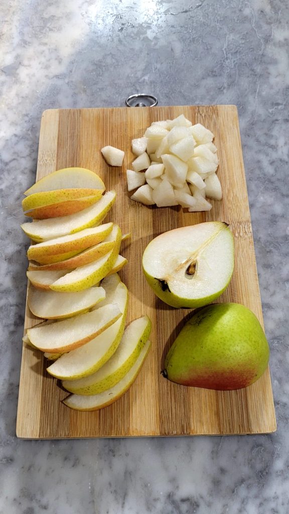 Nachdem Sie die Birnen gewaschen und getrocknet haben, schneiden Sie eine davon in Scheiben, entfernen Sie das Kerngehäuse und die Kerne und lassen Sie die Schale dran. Schälen und würfeln Sie die anderen beiden und halten Sie sie bereit