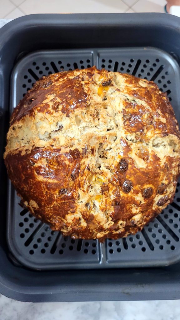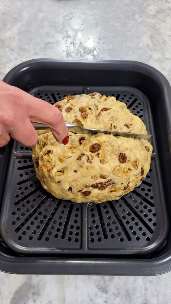 Nach Abschluss der Gärung die Fritteuse im Programm Backen oder Luftfrittieren auf 160°C für 2/3 Minuten vorheizen. Den Brotlaib auf das Gitter legen und mit einem Messer kreuzweise einschneiden