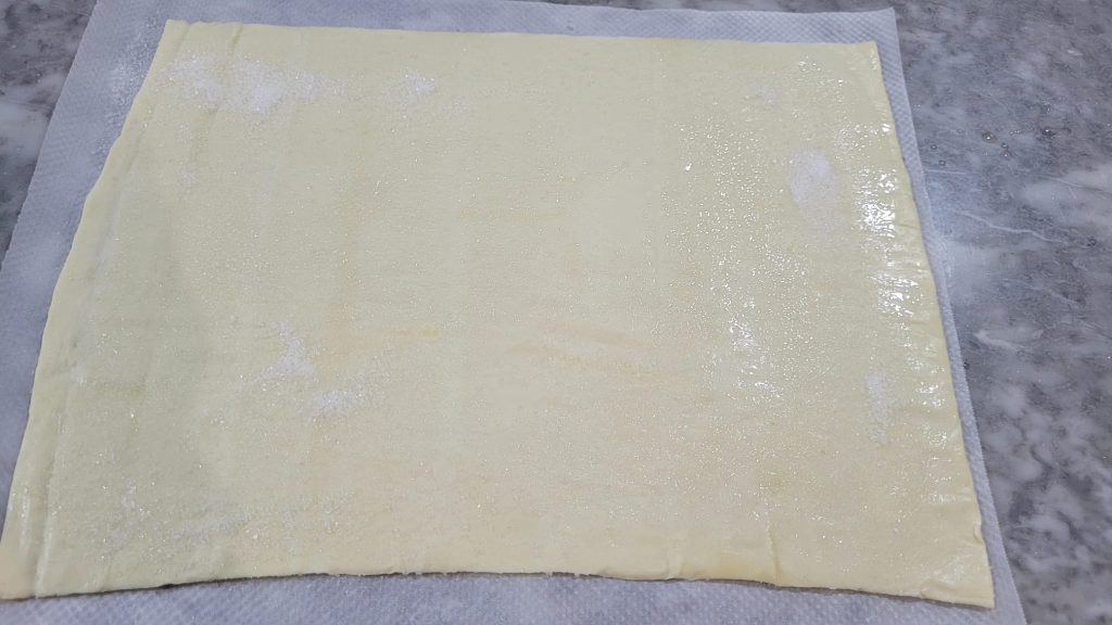 Bestreiche die Oberfläche mit Wasser und bestreue den gesamten Blätterteig mit Zucker. Drehe den Blätterteig um, indem du ein weiteres Backpapier zur Hilfe nimmst, und bestreiche und bestreue auch die andere Seite mit Zucker