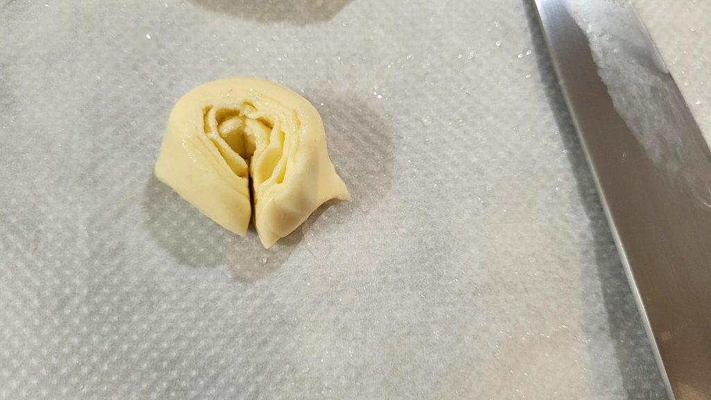 Schneide nun mit einem Messer den Blätterteig in etwa 1,5 cm dicke Scheiben