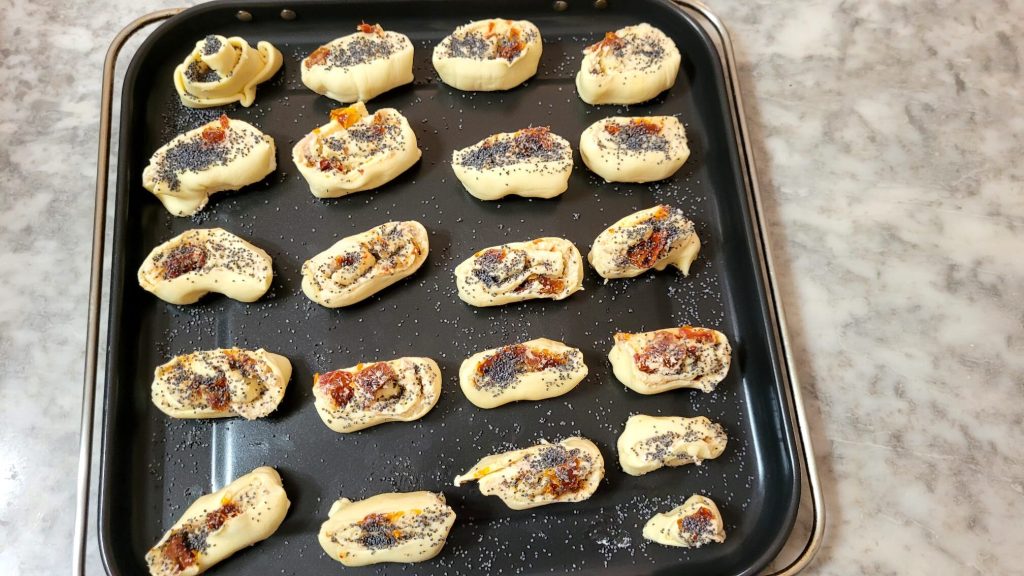 Legen Sie die Blätterteig-Schnecken auf ein mit Backpapier ausgelegtes Blech, heizen Sie den Ofen vor und backen Sie bei 170° Grad für 15/20 Minuten