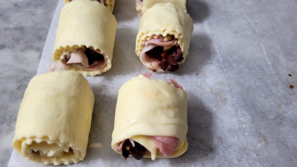Am unteren Ende jedes Blätterteigstreifens legen Sie ein großes Stück gekochten Schinken, die Tomaten mit den Oliven und ein Stück Käse