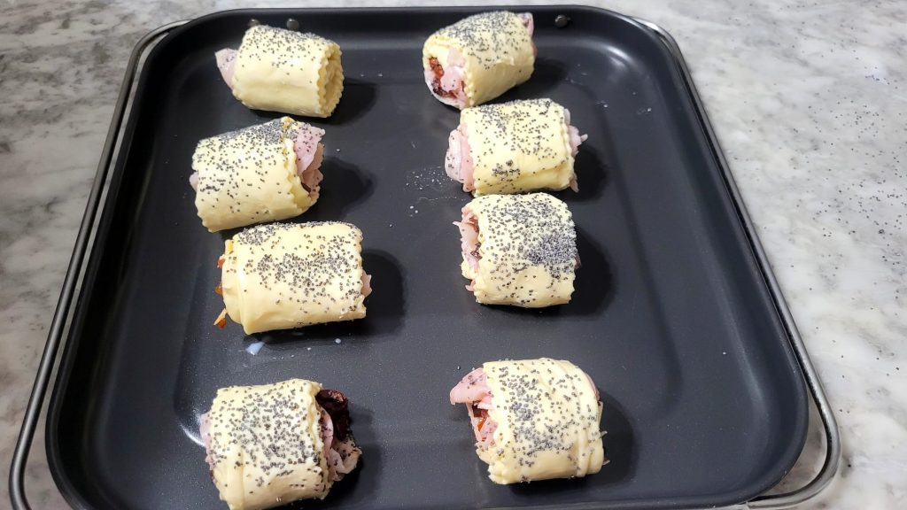 Die Blätterteig-Taschen in der Heißluftfritteuse sind sehr lecker und perfekt für einen Aperitif, ein Buffet, aber auch als Vorspeise für Ihre Festtafeln. Ich habe daran gedacht, sie mit getrockneten Tomaten, entkernten Oliven, gekochtem Schinken und Käse zu füllen, aber sie können auch mit gegrilltem Gemüse oder geräuchertem Lachs und Frischkäse zubereitet werden.