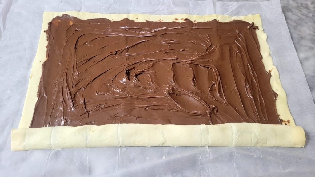 • Den Blätterteig ausrollen und die Nutella mit Hilfe eines Spatels oder dem Rücken eines Löffels aufstreichen, dabei einen Rand von ca. 1 cm lassen