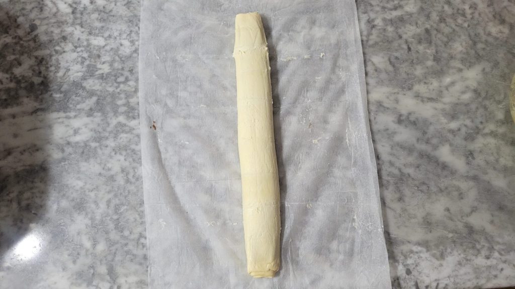 • Den Blätterteig von der langen Seite her aufrollen, dabei das Backpapier zur Hilfe nehmen und beim Aufrollen leicht andrücken