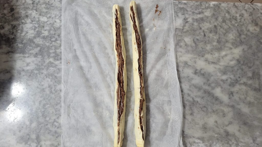Wie bereits erwähnt, benötigt man für die Zubereitung des Blätterteigkranzes mit Nutella nur wenige Minuten und Zutaten: ein rechteckiger Blätterteig und Nutella. Man muss nur die Creme auf den Teig streichen, aufrollen, halbieren und flechten, aber das sehen Sie genauer im Abschnitt der Schritte.