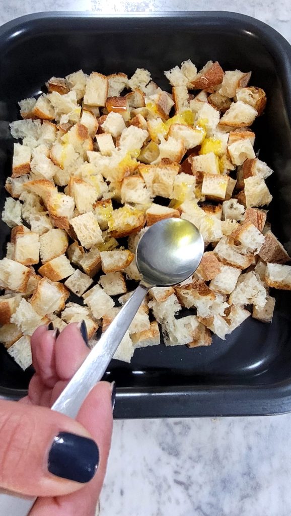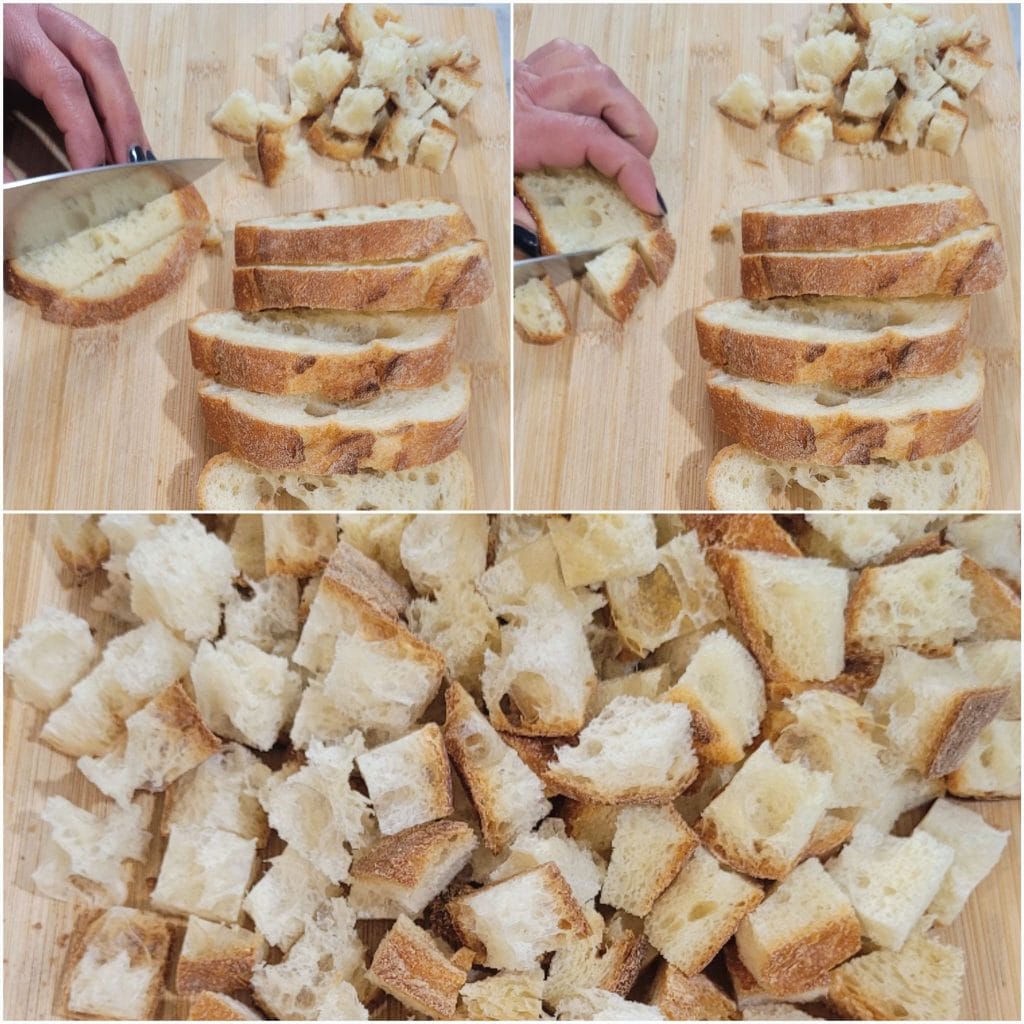 Schneidet das Brot in Würfel, die ungefähr gleich groß sind
