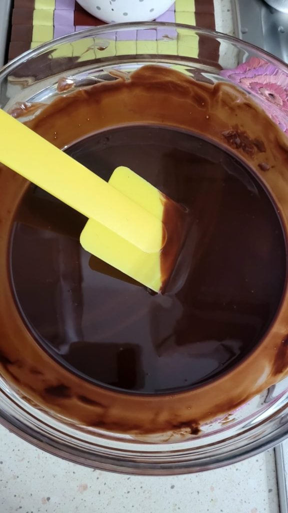 • Wenn die Schokolade vollständig geschmolzen ist, nehmen Sie die Schüssel vom Topf und stellen Sie sie beiseite