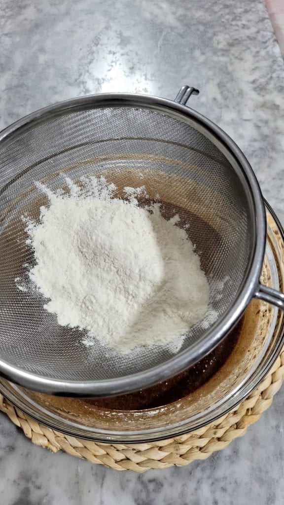 • Fügen Sie in zwei Schritten Mehl, Backpulver und Salz hinzu, indem Sie sie sieben, um Klumpen zu vermeiden.