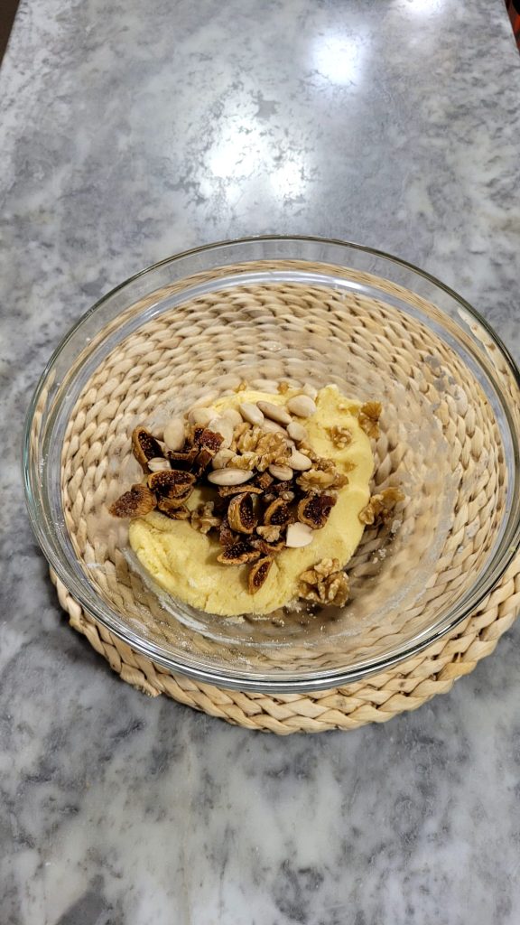 Backen von Cantucci mit getrockneten Feigen, Mandeln und Walnüssen im Ofen