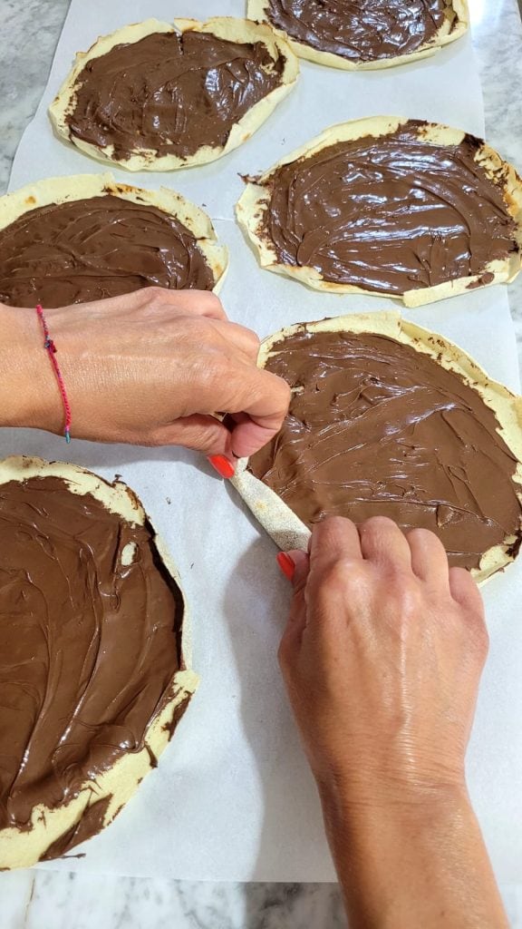 Bestreichen Sie jedes Blatt mit 1 oder 2 Löffeln Nutella