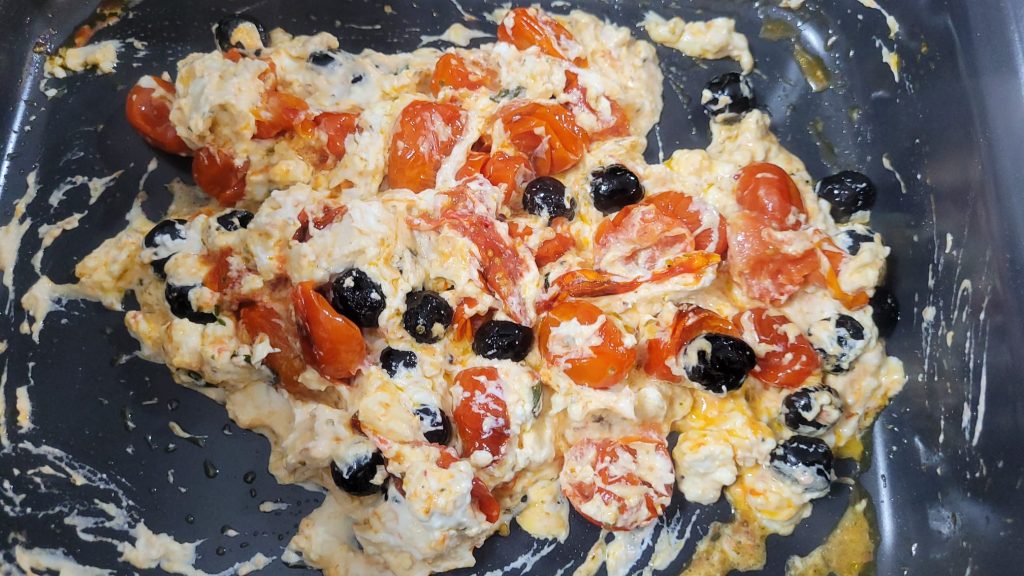 Nehmen Sie die Auflaufform aus der Heißluftfritteuse, wie Sie sehen, ist der Feta kompakt, aber weich geblieben