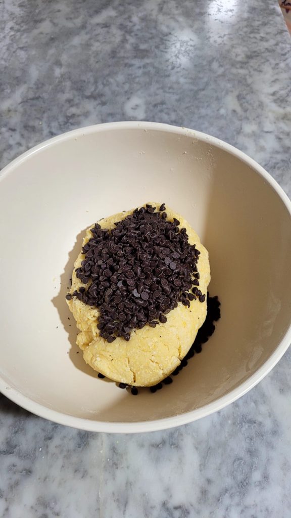 • Sobald die Mischung beginnt, sich zu verbinden, die Schokoladenstückchen hinzufügen und weiterkneten, entweder in der Schüssel oder auf einer Arbeitsfläche, bis eine glatte Masse entstanden ist