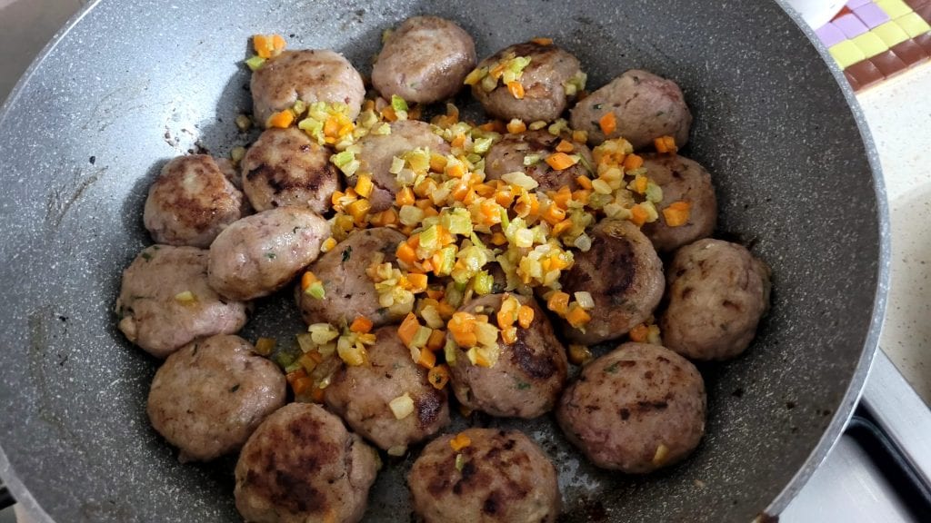 In einer Pfanne braten Sie bei niedriger Hitze das Soffritto mit der Hälfte der Butter an, einmal fertig geben Sie es auf einen kleinen Teller und in derselben Pfanne fügen Sie den Rest der Butter hinzu und braten die Fleischbällchen an, bis sie gut versiegelt sind. Sobald sie angebraten sind, fügen Sie das beiseite gestellte Soffritto hinzu, mischen und gießen die Milch und einige Salbeiblätter hinzu. Lassen Sie es bei mittlerer Hitze etwa 30 Minuten kochen und würzen Sie es mit Salz.