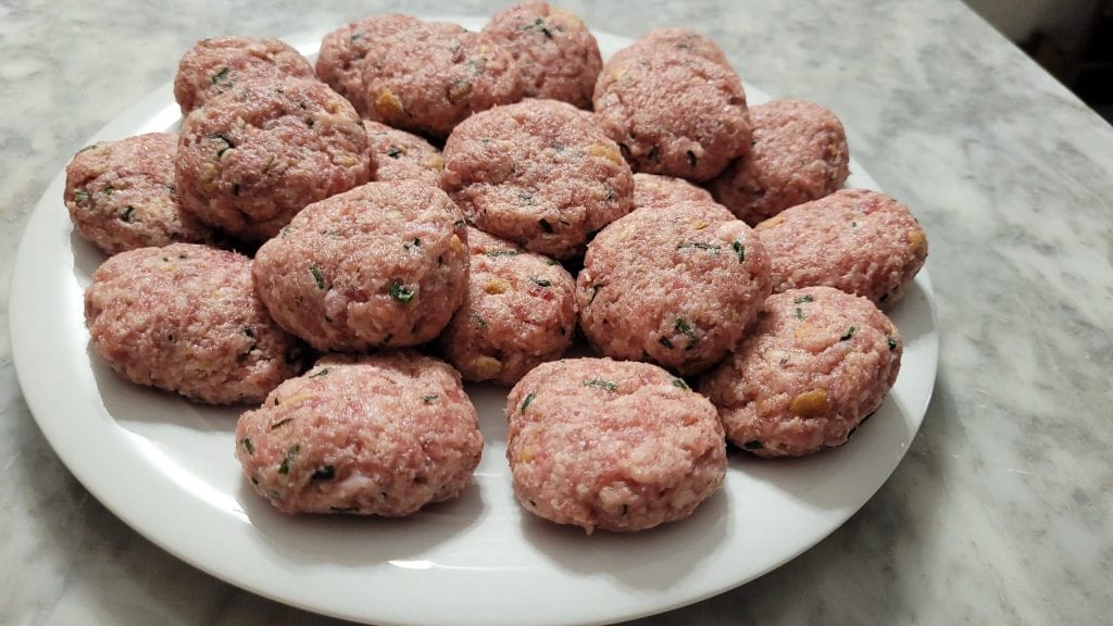 Nehmen Sie einige Stücke des Teigs und formen Sie die Fleischbällchen, indem Sie sie leicht plattdrücken