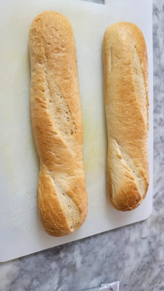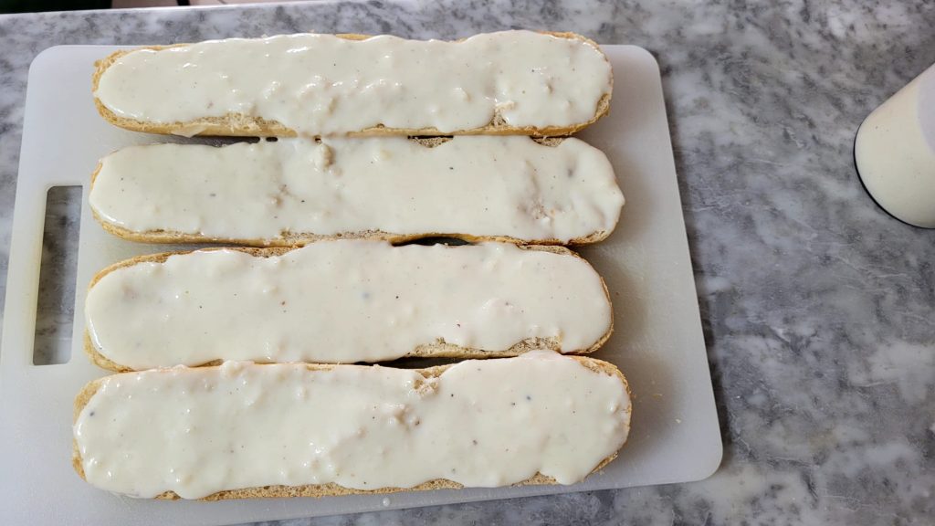 • Sobald es fertig ist, jedes Baguette diagonal halbieren