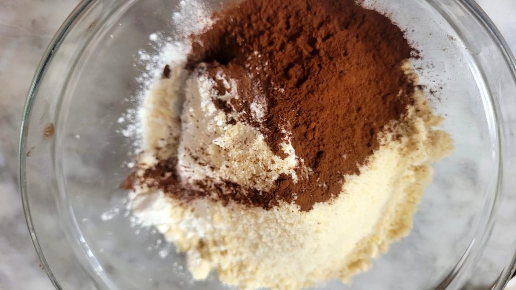 • Fügen Sie nun das Mehl 00, das Mandelmehl und den ungesüßten Kakao hinzu und arbeiten Sie den Teig weiter
