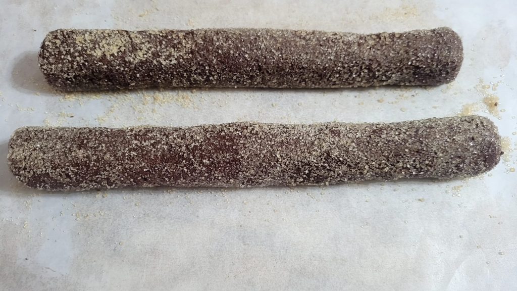 • Auf Backpapier oder einer Arbeitsfläche formen Sie zwei Rollen mit einem Durchmesser von etwa 4 cm