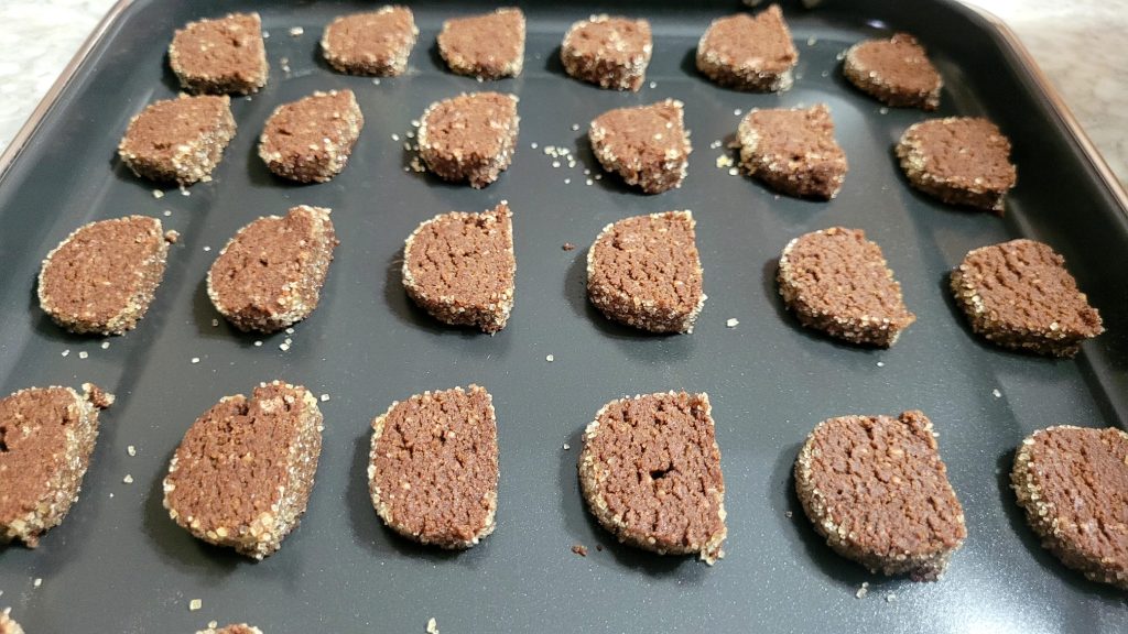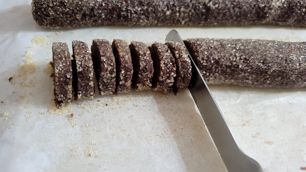 • Nach der Ruhezeit nehmen Sie die zwei Rollen wieder heraus und schneiden Sie sie in Scheiben von etwa einem halben Zentimeter Dicke