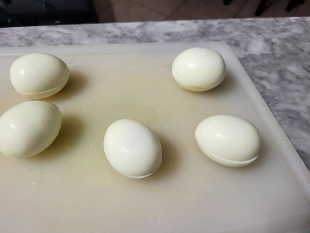 Sobald sie abgekühlt sind, schälen Sie die Eier und schneiden Sie sie der Länge nach in zwei Hälften